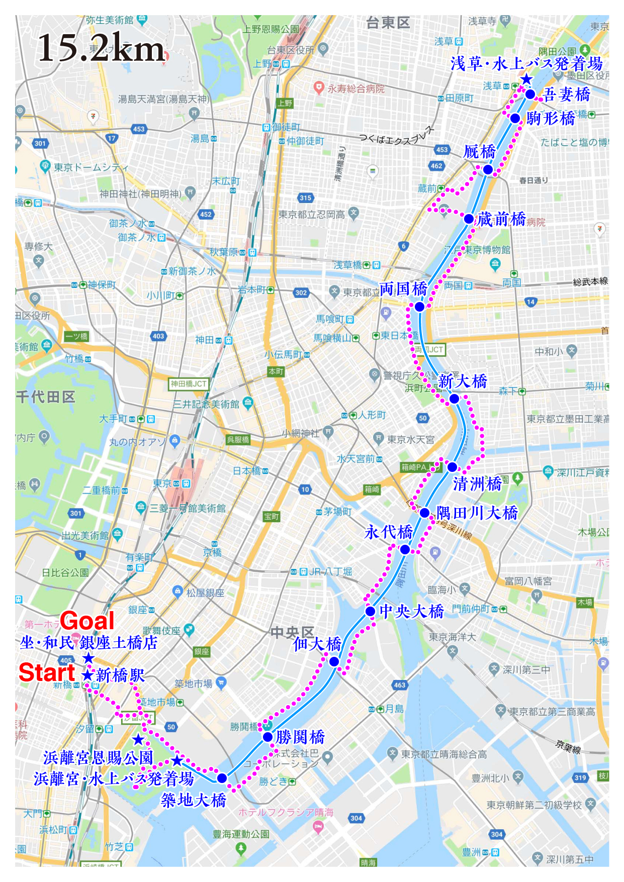 | 2018.11.06 新橋駅→浅草→浜離宮恩賜公園→坐・和民銀座土橋店 15.2km route |