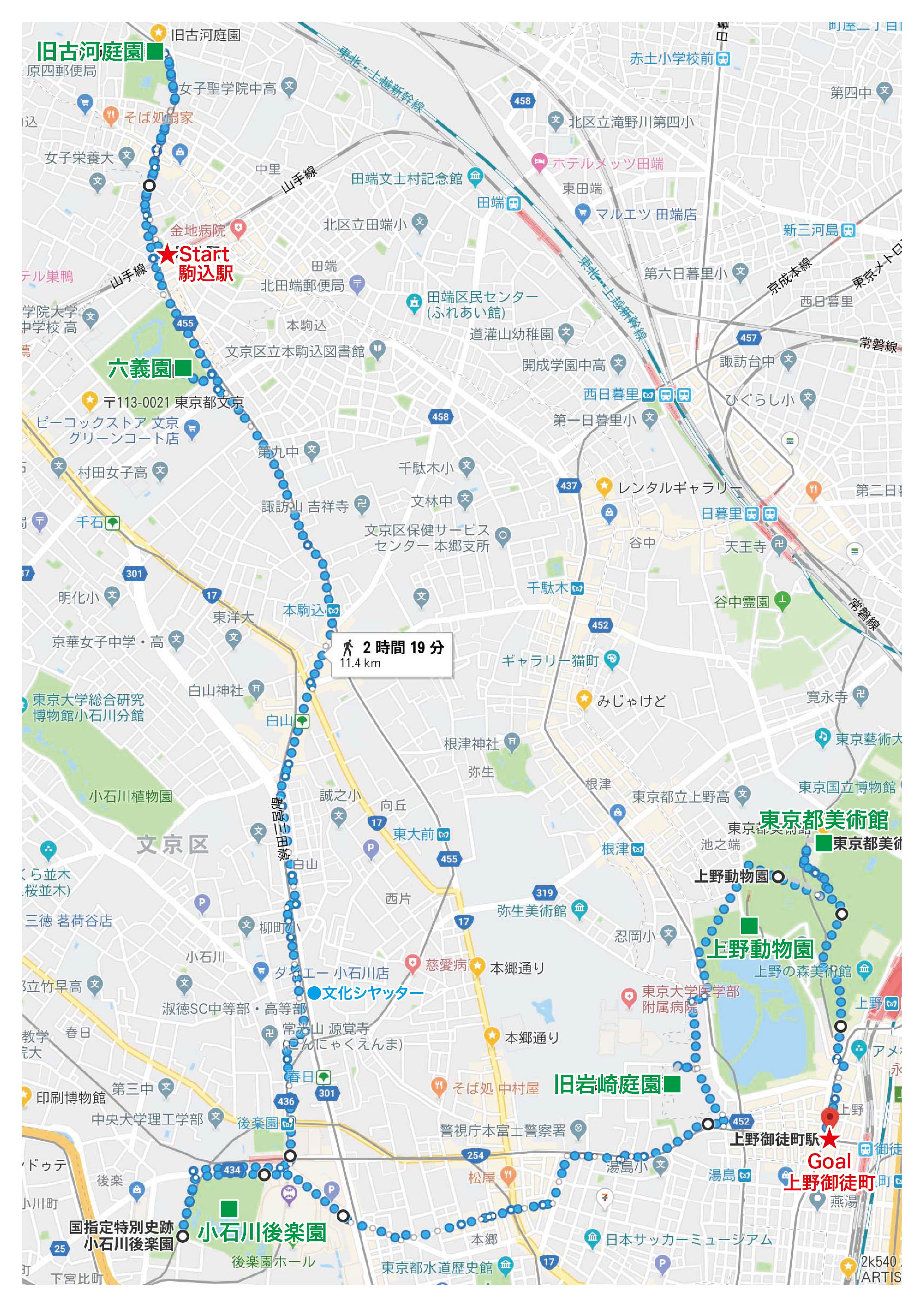 | 2018.10.01 駒込駅→旧古河庭園→六義園→小石川後楽園→旧岩崎庭園→東京都美術館→御徒町駅 11.4km route |