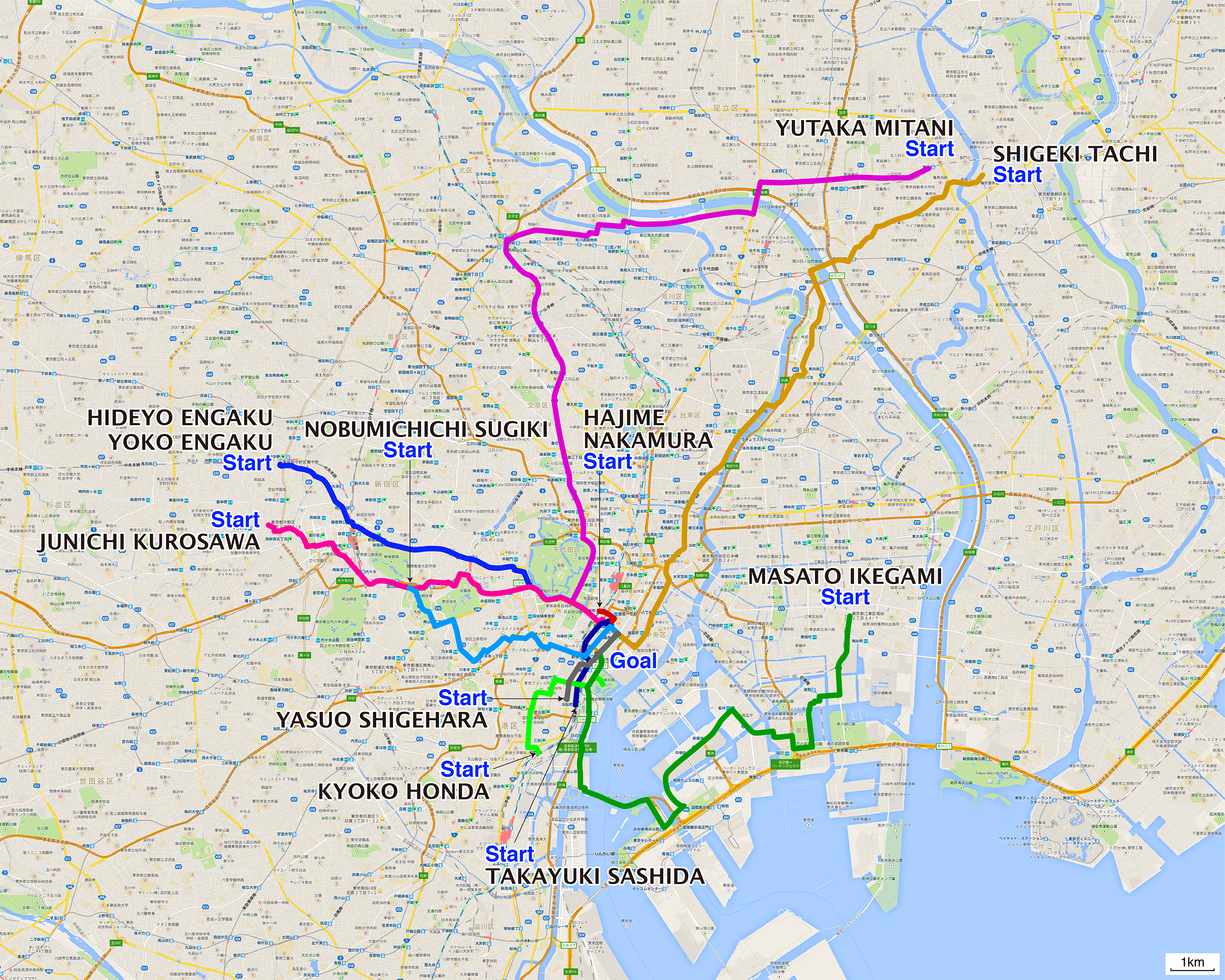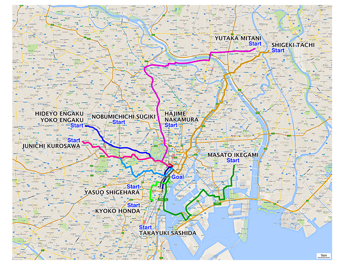 | 001 池上正人 | 江東区南砂町二丁目→木挽町砂場 16.6km | route | 002 黒澤淳一 | 中野区本町二丁目→木挽町砂場 10.2km | route | 003 圓角秀世 | 東中野二丁目→木挽町砂場 9.8km | route | 004 三谷 豊 | 亀有駅→木挽町砂場 21.8km | route | 005 中村 肇 | 有楽町駅→さくら水産銀座三丁目店 0.5km | route | 006 杉木伸通 | 国立競技場駅→木挽町砂場 7.4km | route | 008 重原保男 | 大門駅→木挽町砂場 2.3km | route | 010 圓角陽子 | 東中野二丁目→木挽町砂場 9.8km | route | 011 本田京子 | 田町駅→木挽町砂場 4.9km | route | 015 指田隆行 | 浜松町駅→さくら水産銀座三丁目店 2.8km | route | 017 舘 成樹 | 葛飾区新宿五丁目→木挽町砂場 16.7km | route |