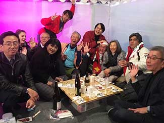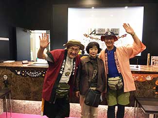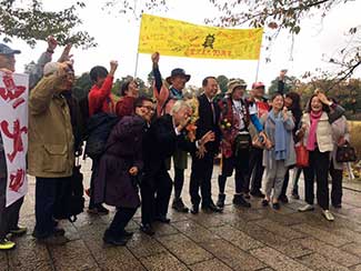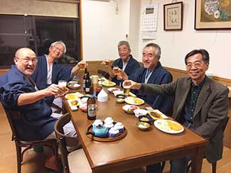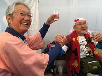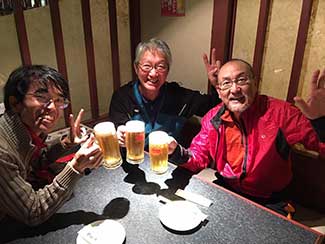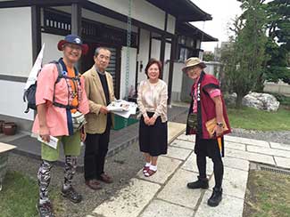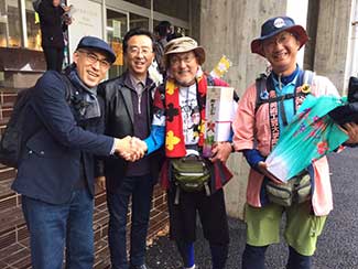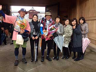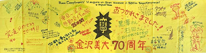 16:00 大手門からずっと同行してもらった鈴々舎馬桜師匠も一緒に美大へ。寺井先生、角谷先生、大路元事務局長などに皆さんに出迎えてられ、美大開学70周年の祝い参勤交代ウオーキング完歩の報告をして25日間の参勤交代ウオーキングが無事に終了した。模擬店内で後藤先生や奥様も交えて祝杯をあげる。
