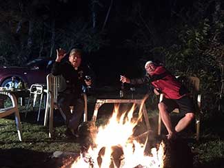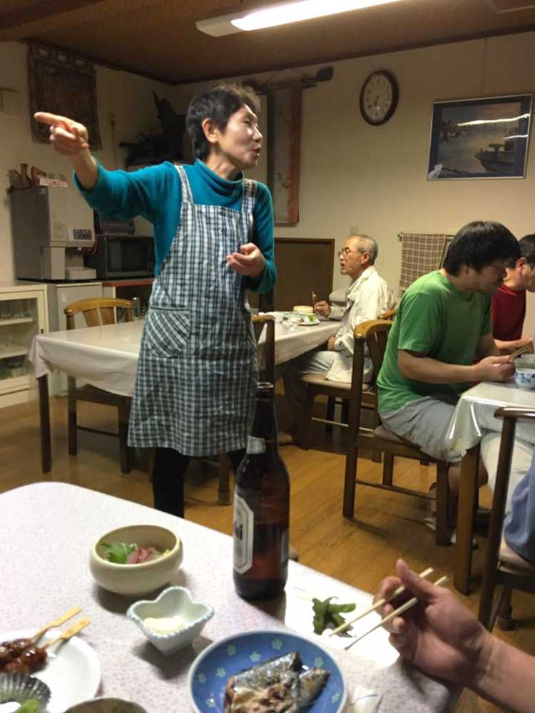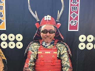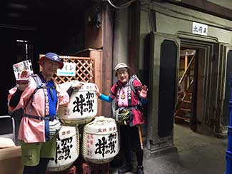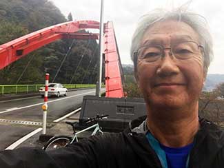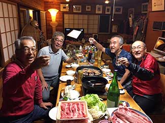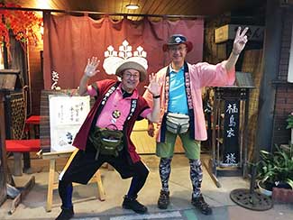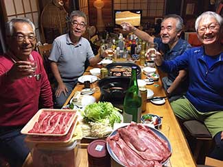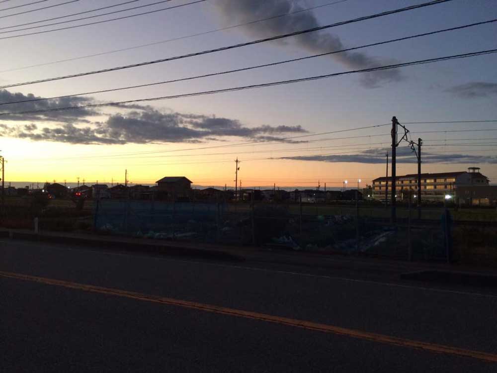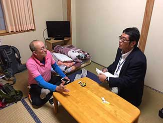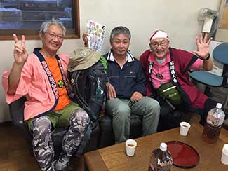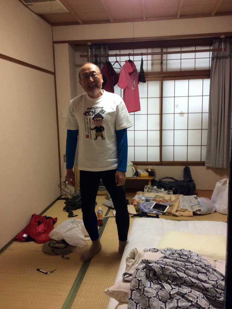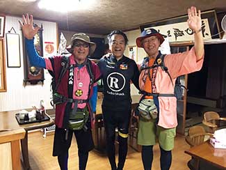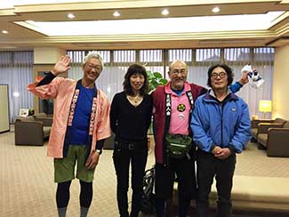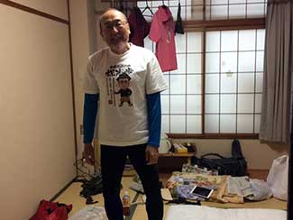 17:10 「だるま旅館」到着前にまたまたサプライズ。夕暮れでシルエットでしか見えない・・・。あっ!宮下印刷の宮下会長はじめ社員のみんなが総出で出迎えだ。え〜!ビックリポン。みんなからのメッセージ入りのサプライズTシャツを頂く。明日これを来て入城しよう。これにはビックリして疲れも忘れ感激した。ありがとう〜!
