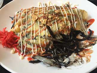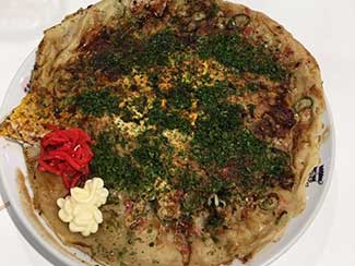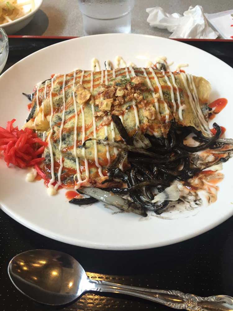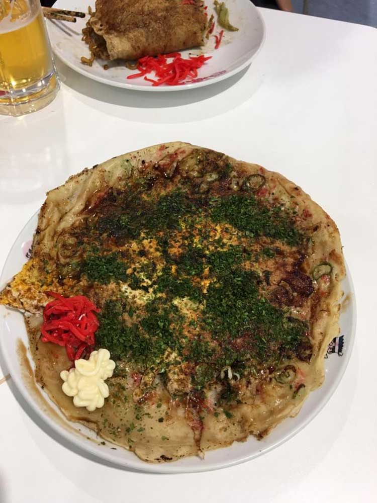 12:30 せっかくなんで行田熊谷名物の「ふらい」を食べる。見た目屋台のキャベツお好み焼き。モチモチの小麦粉に小エビ、キャベツ、蕎麦、卵などが乗せられて半分に折ってお皿に乗せ、ソース、青海苔をかけて完成。ボリューム満点な500円、ふらい焼きそば600円。