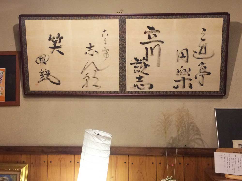 18:40 トロン温泉(薬石を使った人工温泉)に入り身体をほぐし、晩飯食べて21:30に寝る。この「きん藤旅館」の玄関に東京落語四天王と呼ばれた古今亭志ん朝、三遊亭円楽(先代)、立川談志と橘家円蔵(元月の家円鏡)の直筆サインの額装が飾られていた。以前この旅館で落語会を開催されていたらしい。