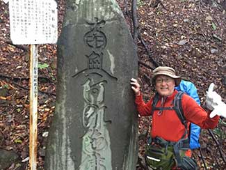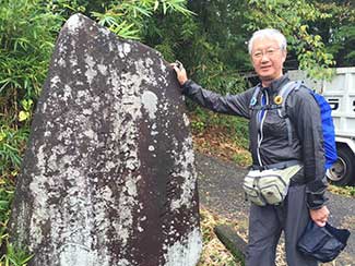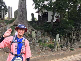 10:30 峠の茶屋のような「お休み処」の旗が掲げられた雑貨駄菓子屋でトイレ休憩。ご主人のヤナイさんに店のこと、この辺りの話などを聞く。石田オロナミンで栄養補給。娘さんからコーヒーを頂く。有難い。庚申塔の石塚が100個並ぶ「百庚申」で記念撮影。圧巻。