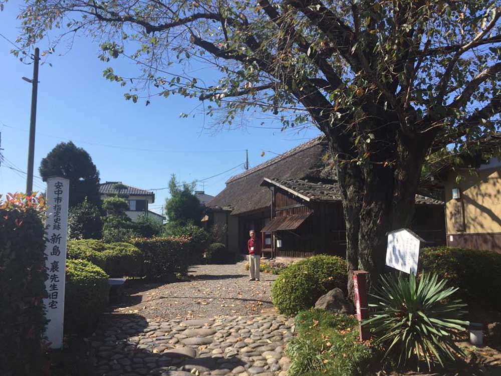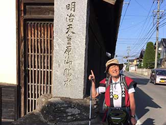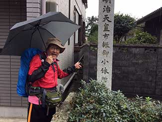 新町に入る。八坂神社に松尾芭蕉の句を見つける。「傘(からかさ)に おしわけ見たる 柳かな」。その先に明治天皇在行の地という公園と和風建築物が保存されいた。