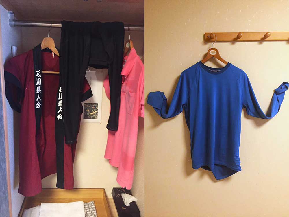 8:30 美大バレー部の後輩である高橋裕恵さんがだるま旅館に突然現れ支度中のボロ姿を撮られる(笑)。昨夜宮下印刷のみんなから贈られたTシャツを着込み、入城の身支度完了。昨日夕飯を共にした吉田洋さんも食堂で待機。祈りが効かず雨が・・。それも雷と一緒に大雨に・・。嗚呼〜。