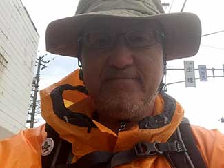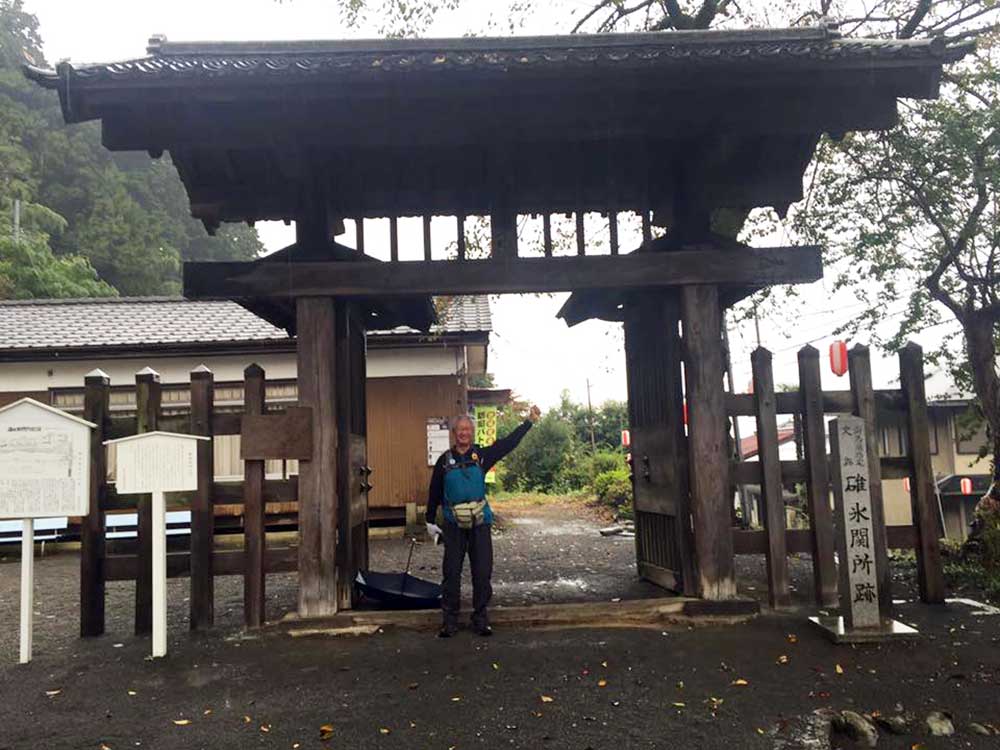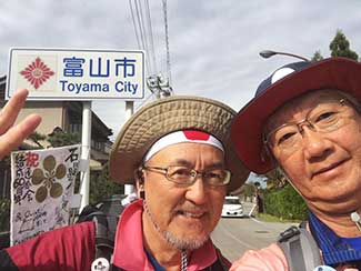 8:30 原秀二さんがホテルに到着。彼は高岡市在住で美大の10年後輩。KANABIあ・そ・び・隊の重原隊員の息子さんと高校の同級生という関係でこの参勤交代ウオーキングに同道してくれることになった。一昨日の富山マラソンをフル完走したとは思えない足取りでいろいろサポートして頂いた。一緒に「いなり鉱泉」を出立。予報どおり雨が降って来た・・。