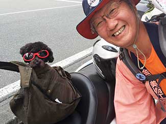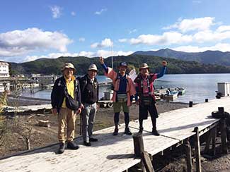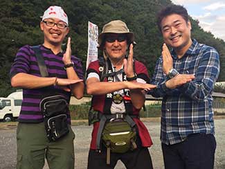 ★石田:8:30 いなり鉱泉、出発します。左の方は重原さんの息子さんの友人で美大の後輩、原さん。富山駅前で竹綱さんと合流。昨日のKANABISM展搬入で金沢に来ていました。今日は二人とも高岡まで同道です。ありがとう!!