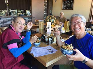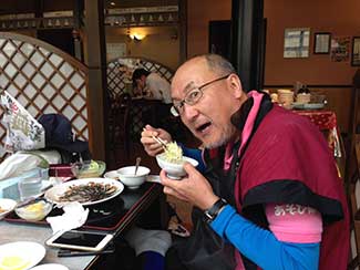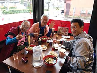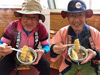 長野宿で陣中見舞いに来てくれた美大後輩の水野さんが再び石動に来てくれた。ありがとう!一緒に昼食。ラーメン&チャーハンを食す。何と!西村東海支部長もこの場に応援に駆けつけて下さった。我々全員の昼食代を出して頂く。ご馳走様でした!