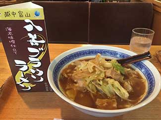 13:30 射水市役所小杉地区センターで「赤壁屋酒屋」という建造物を探して貰う。場所をようやく突き止めた。昼飯は原さん推薦の「富山ブラックラーメン」 発祥の店に入る。「いろは本店」。室内案内板には「東京ラーメンショーで4連覇!」した由緒あるブラックラーメン店。魚介の味が濃く旨かった。原さんにご馳走になる。感謝。