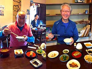 11:50 「六助うどん」の看板。12時前なのに駐車場が一杯なのを見て石田が「ここ入いろ!絶対旨いと思う」で入ったらもう満席。カツ丼とうどんのセットを注文。これがまた凄い!豚の肉厚(3cm)とボリューム満点。うどんはしこしこの手打ち。参った!お腹がパンパンでゲップゲップ。リュックのベルト緩めるがキツイ。歩けない。