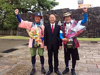 大手門の坂の上にMROと北陸テレビ朝日のテレビクルーと大勢の出迎えの方々が。右に曲がると黄色のフラッグと、大勢の人々が。山野市長がこの寒空の中、コート無しのスーツ姿で立って出迎えて頂く。市役所から花束を頂戴する。感謝。感動!言葉が無いほど嬉しかった。無事に到着した。石田と握手。その後金沢城をバックにテレビのインタビュー。